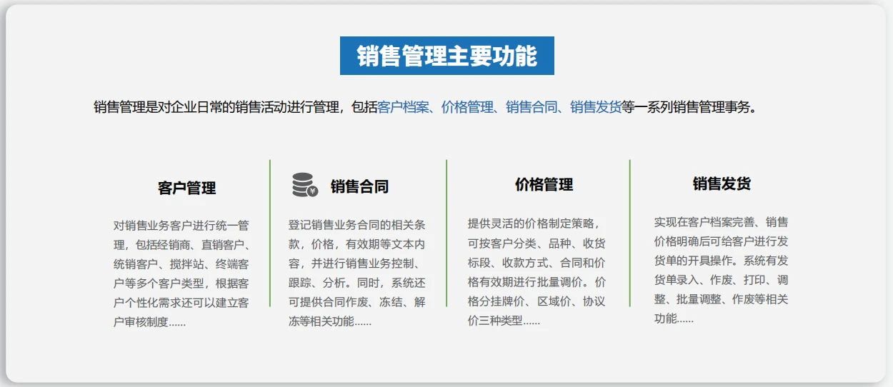销售管理是对企业日常的销售活动进行管理,包括客户档案、价格管理、销售合同、销售发货等一系列销售管理事务。